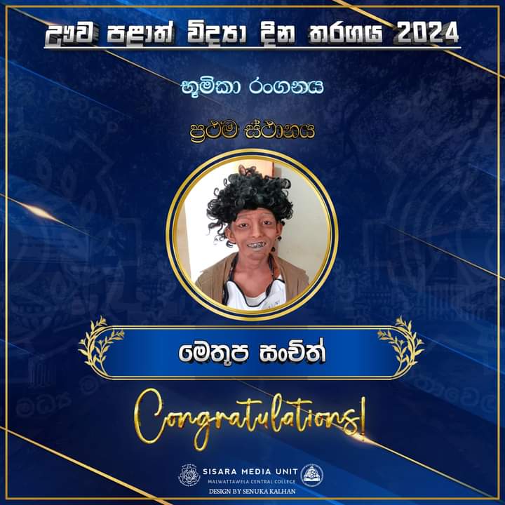 ඌව පළාත් විද්‍යා දින තරඟය -2024 භූමිකා රංගනය ප්‍රථම ස්ථානය අප විදුහලේ මෙතුල සංචිත සිසුවා වෙත.ඔහුට අපගේ උණුසුම් සුබ පැතුම්.